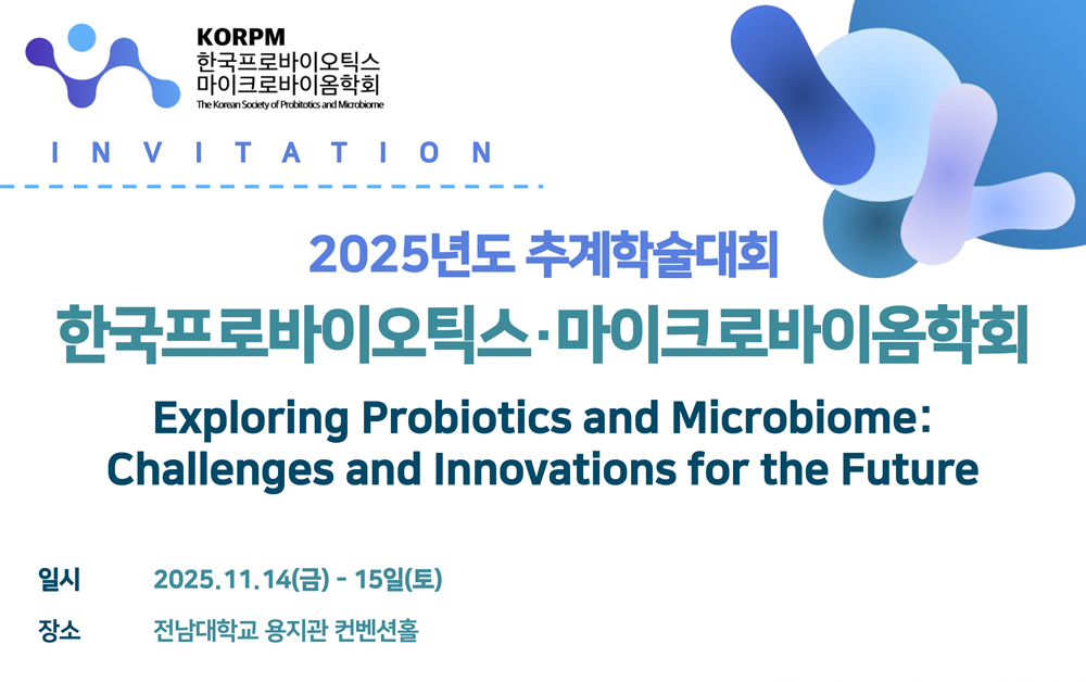 2025 추계학술대회 포스터 발표 안내 2025년 11월 14일(금) 전남대학교 용지관 컨벤션홀에서 개최되는 2025 한국프로바이오틱스·마이크로바이옴학회 추계학술대회 포스터 발표 관련 사항을 다음과 같이 안내드립니다. 포스터 발표 번호는 첨부파일을 통해 확인해주시기 바랍니다.